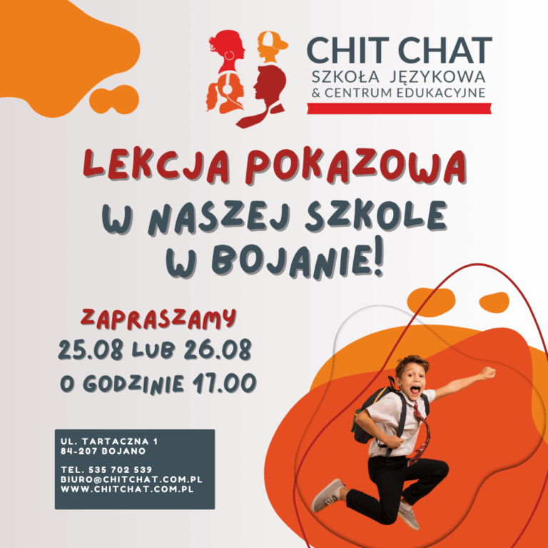 Zapraszamy najmłodszych odkrywców języka angielskiego naBEZPŁATNE LEKCJE OTWARTE!  Przedszkolaki (3–6 lat) Uczniowie szkoły podstawowej (6–10 lat)  Poniedziałek 26 sierpnia, godz. 17:00lub  Środa 27 sierpnia, godz. 17:00  Dlaczego warto przyjść?  Poznasz nasze metody nauczania najmłodszych   Spotkasz fantastycznych nauczycieli   Zobaczysz kolorową i przyjazną szkołę    Zapisz się, bo miejsca szybko znikają! 535 702 539 biuro@chitchat.com.pl  Pierwszy krok do przygody z angielskim zaczyna się w Chit Chat!