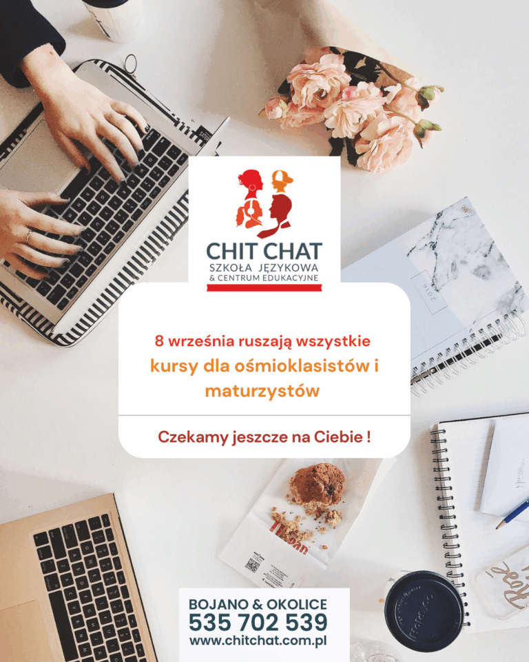 Dzień dobry! Przypominamy, że już 8 września ruszają wszystkie nasze kursy przygotowujące do egzaminów ósmoklasisty i matury. Przedmioty:- Język Polski- Matematyka- Język Angielski Czekamy na ostatnie zgłoszenia i ruszamy już po zbliżającym się weekendzie! Do zobaczenia    Zapisz się, bo miejsca szybko znikają! 535 702 539 biuro@chitchat.com.pl